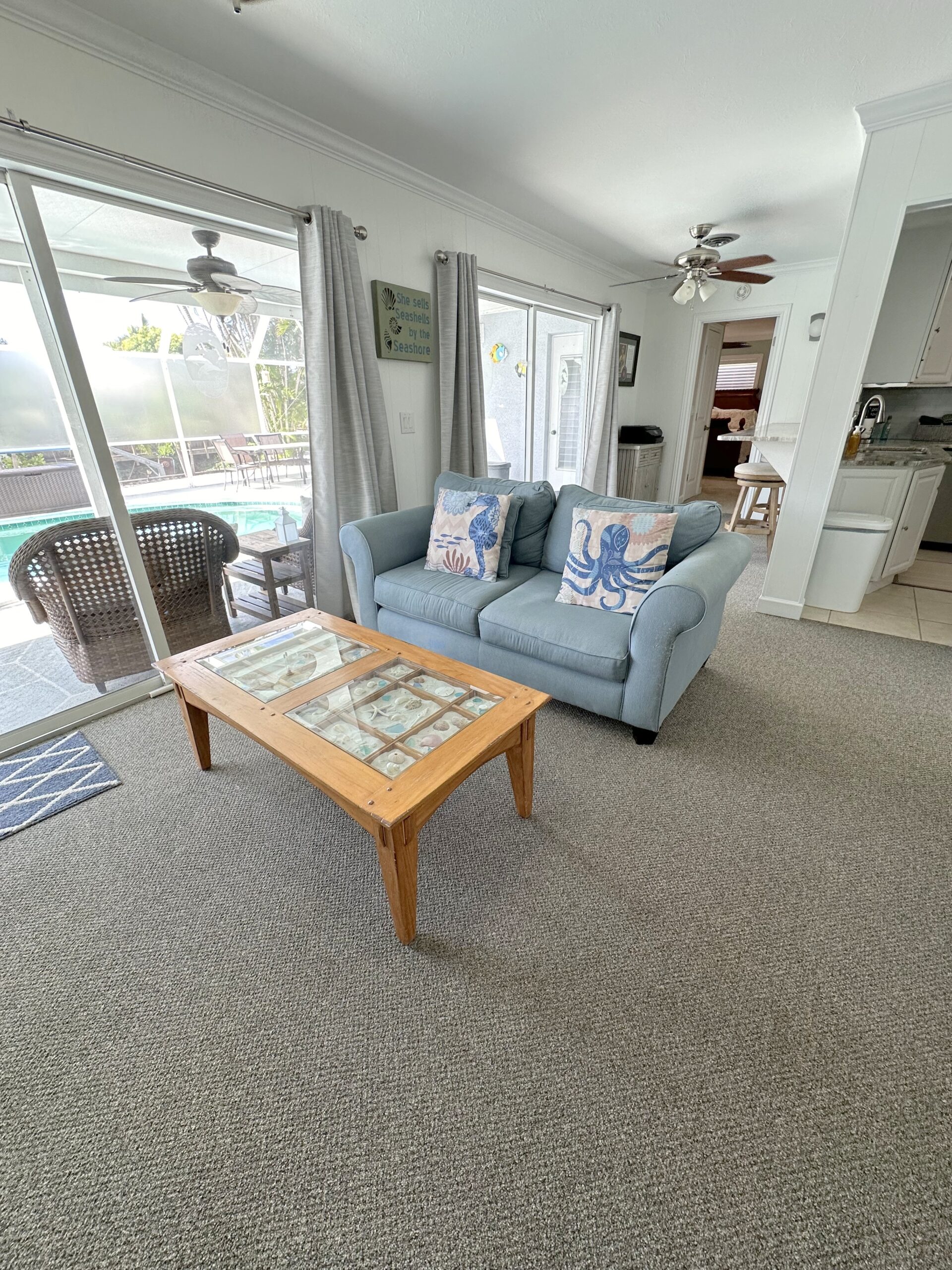 Across from the dining room is the inviting living room, furnished with a spacious sectional and a 65” flat-screen TV, perfect for relaxing after a day in the sun. The Florida Room provides a peaceful retreat overlooking the sparkling pool and lushly landscaped backyard.