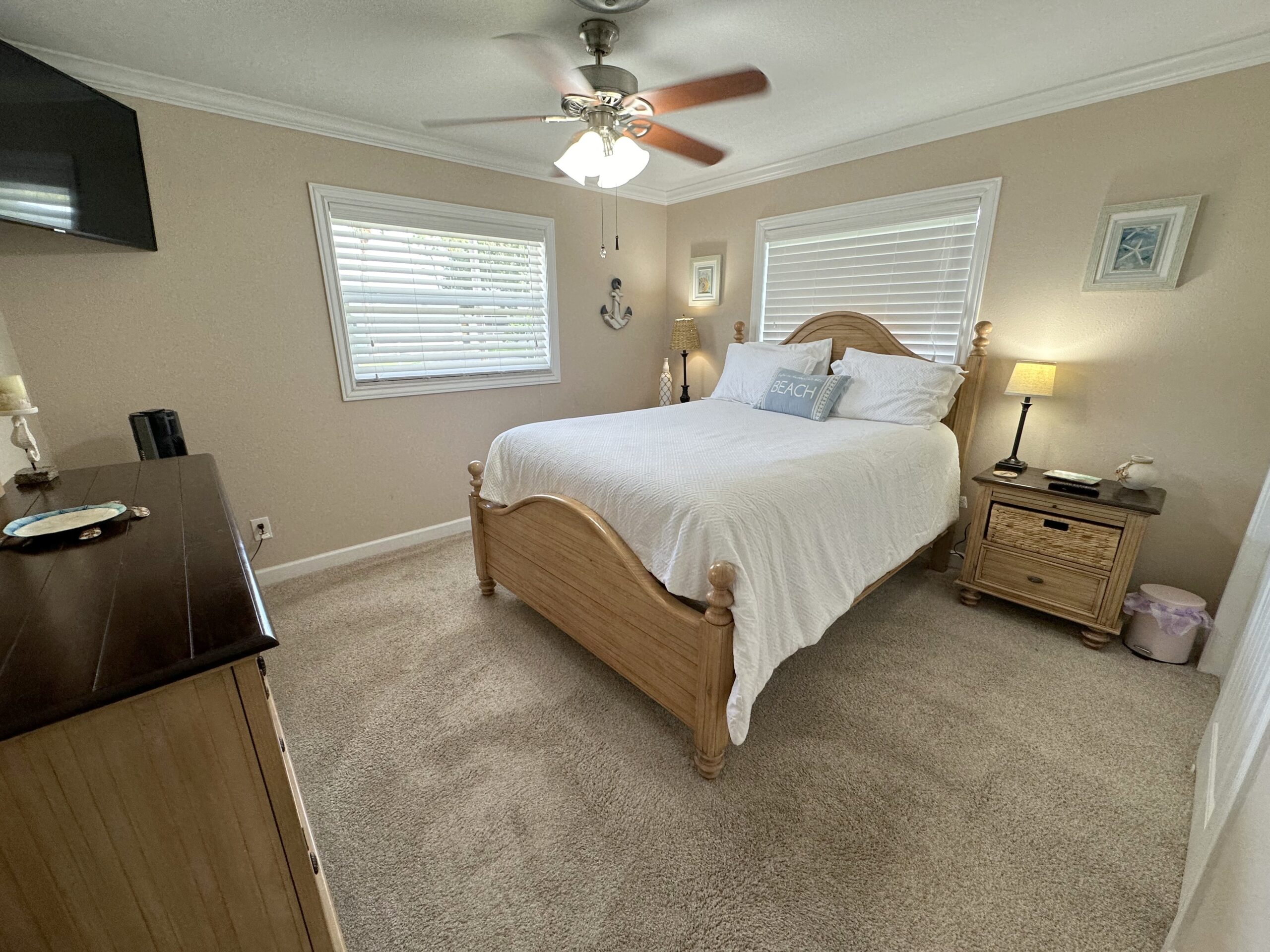 Guest Bedroom 1: Located at the front of the home with a queen bed, nightstands, chest of drawers, and closet.