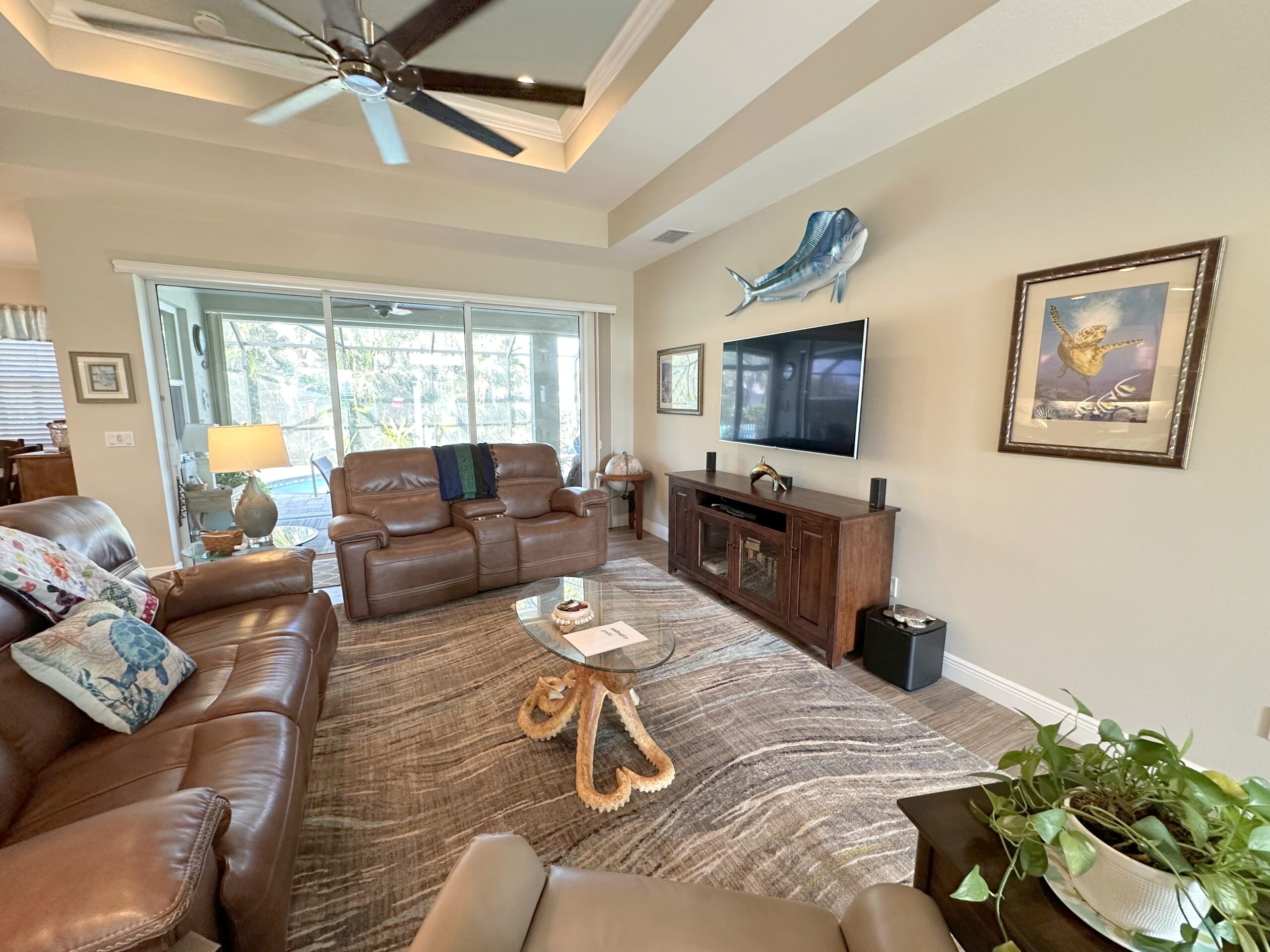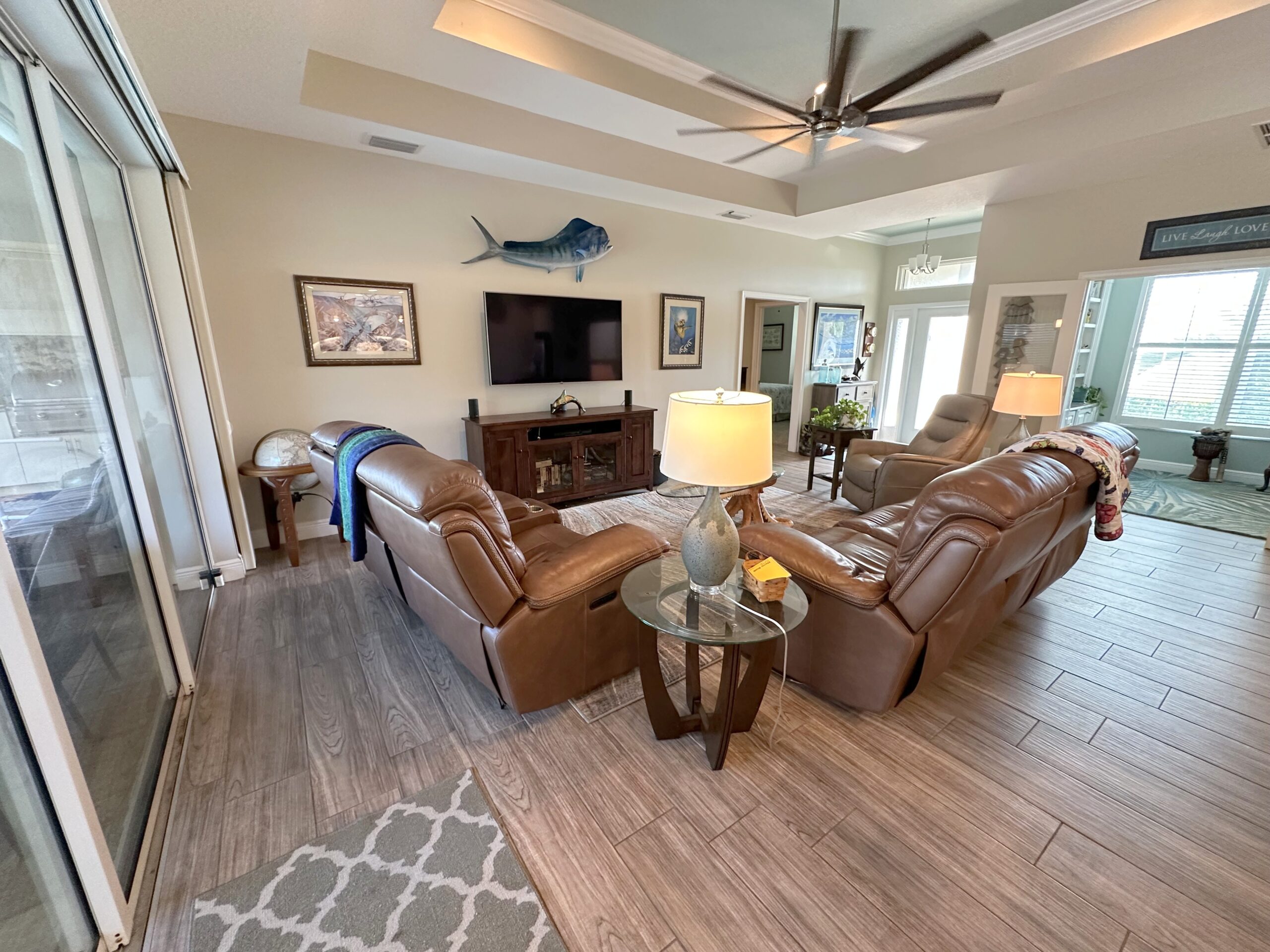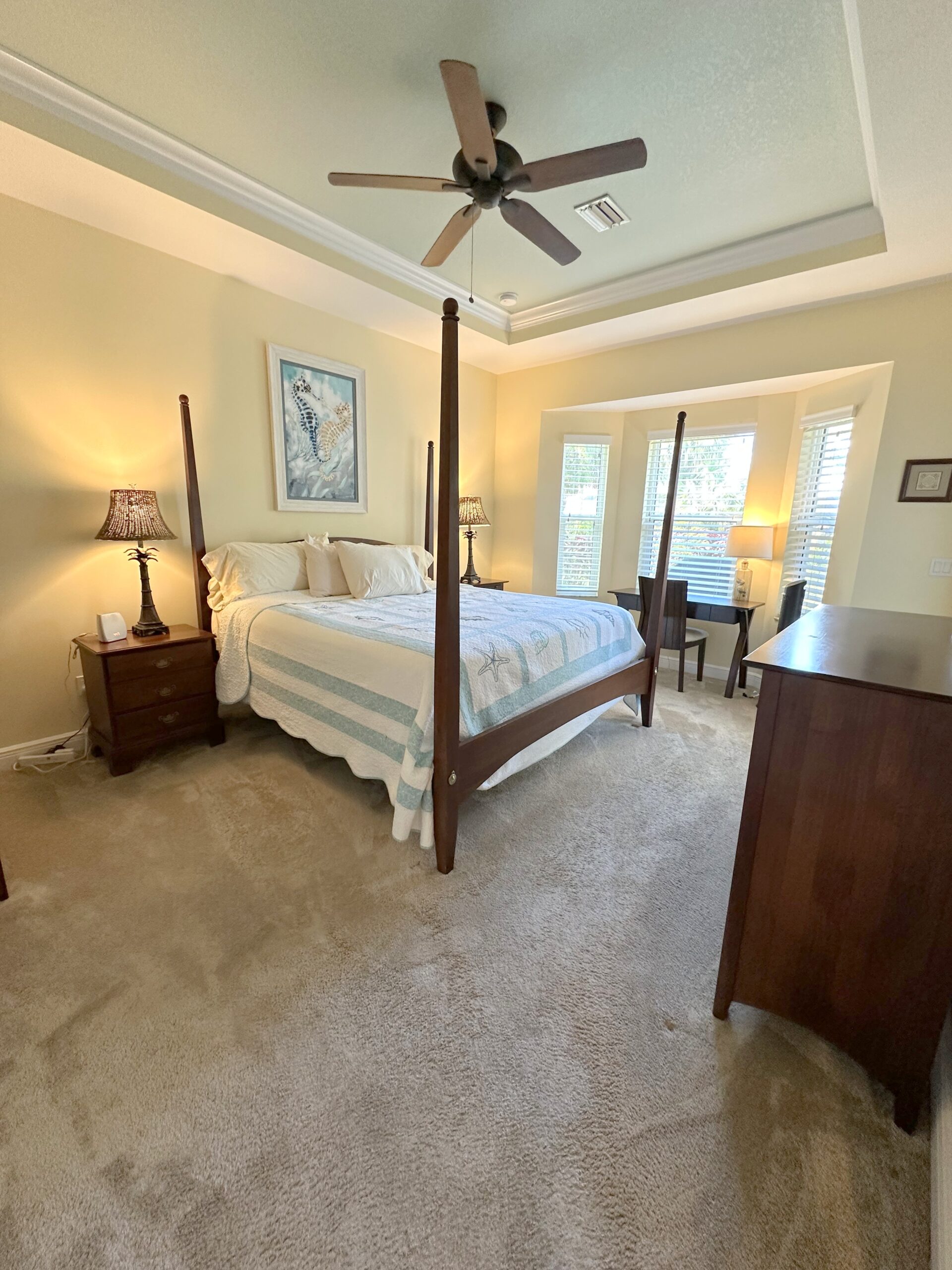 Feel right at home when you walk through the doors to this beautiful 3 bedrooms, 2 bathrooms home that is tastefully decorated in a nautical theme throughout. With over 1800 square feet of living space, you’ll have plenty of room to enjoy yourselves or host a small gathering. There is a great room with an open floor plan for ease of sight throughout. The updated, fully equipped kitchen has plenty of room for your culinary needs. The dining room is just off of the kitchen with enough seating for at least six. If you are looking for some quiet time, close the French doors and enjoy the den just off of the great room to enjoy a great book while watching the neighbors walk by. Or you can enjoy your book while lounging in the sun by the heated pool. Nothing is more Florida than floating around and enjoying the sun from your very own private enclosed pool. The backyard has been fenced in for privacy and to keep your fur baby safely inside. The primary bedroom is off of the kitchen and has a four-post king-size bed for you to enjoy. There is also a desk if work is a must, but hopefully not. There is plenty of room to store your personal belongings as well. The ensuite bathroom connected to the primary bedroom has everything you are wishing for. An updated double bowl vanity, a walk-in shower, and plenty of room so that you aren’t bumping into each other. The large walk-in closet has two entrances. One is off of the ensuite bathroom, and the other is off of the utility room. The guest bedrooms both have queen beds, and the back bedroom has a flat screen TV for guests who want to watch TV in bed. The guest bathroom is situated in between both guest bedrooms for ease of use. It has a tub/shower combo and a large updated single bowl vanity. The flooring throughout the house is laminated wood except in the bedrooms where there is carpet. This home has so much to offer and more. Please don’t hesitate to book this house before it’s too late!