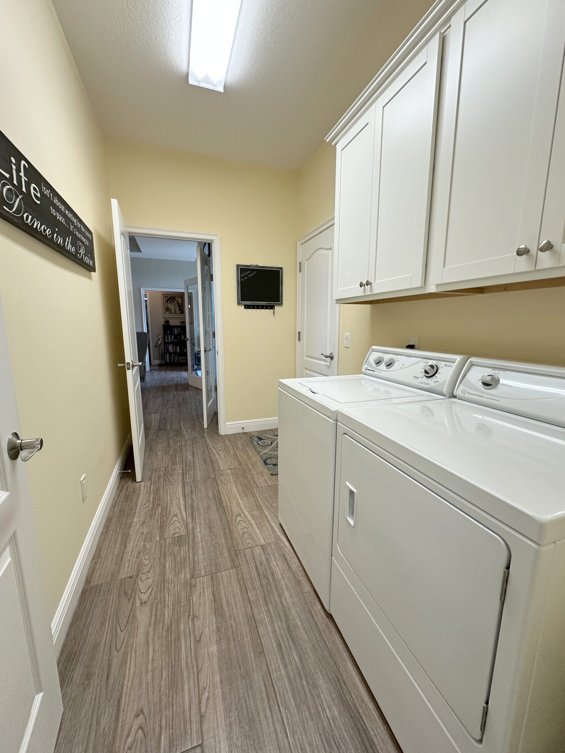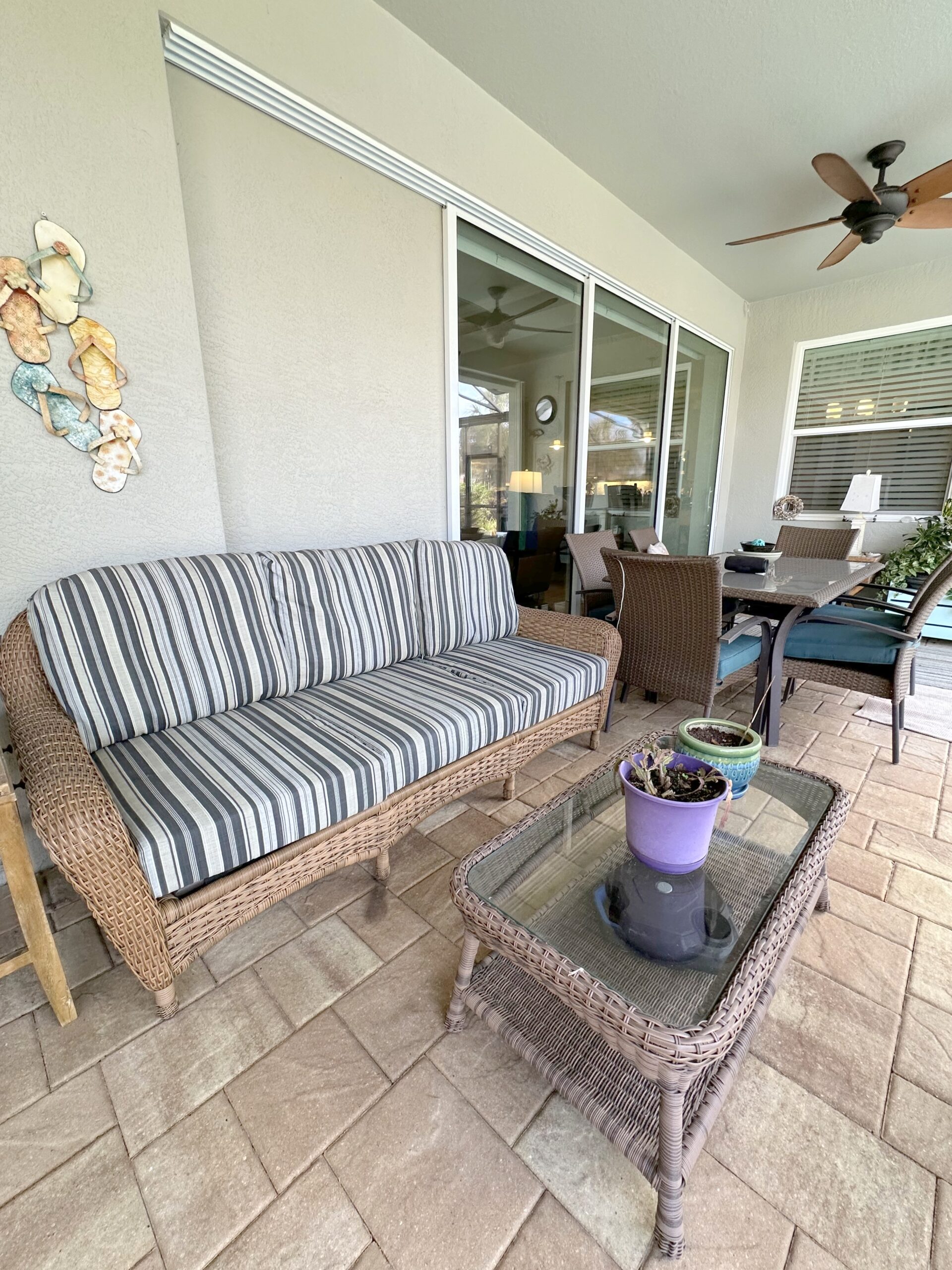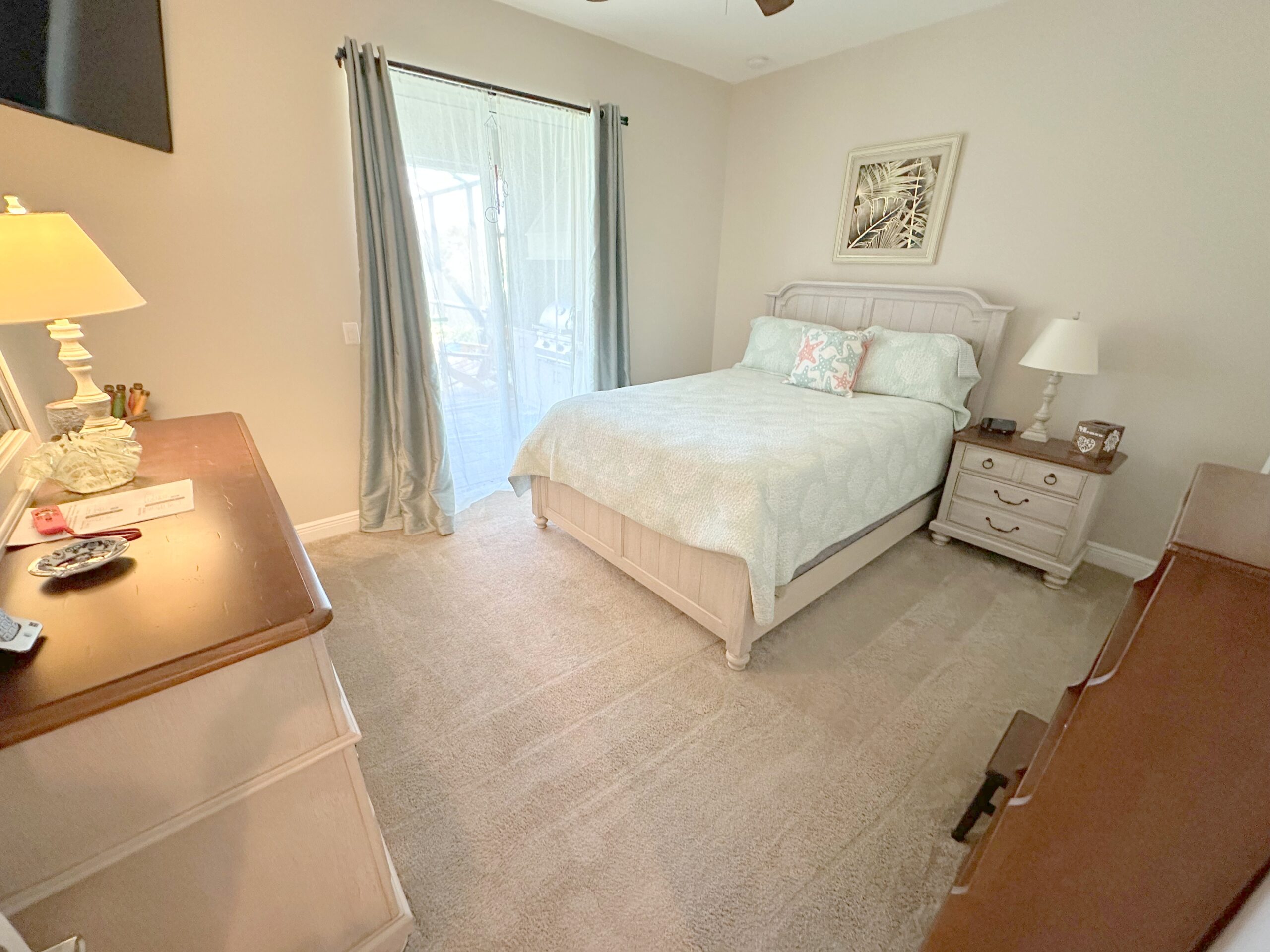 Feel right at home when you walk through the doors to this beautiful 3 bedrooms, 2 bathrooms home that is tastefully decorated in a nautical theme throughout. With over 1800 square feet of living space, you’ll have plenty of room to enjoy yourselves or host a small gathering. There is a great room with an open floor plan for ease of sight throughout. The updated, fully equipped kitchen has plenty of room for your culinary needs. The dining room is just off of the kitchen with enough seating for at least six. If you are looking for some quiet time, close the French doors and enjoy the den just off of the great room to enjoy a great book while watching the neighbors walk by. Or you can enjoy your book while lounging in the sun by the heated pool. Nothing is more Florida than floating around and enjoying the sun from your very own private enclosed pool. The backyard has been fenced in for privacy and to keep your fur baby safely inside. The primary bedroom is off of the kitchen and has a four-post king-size bed for you to enjoy. There is also a desk if work is a must, but hopefully not. There is plenty of room to store your personal belongings as well. The ensuite bathroom connected to the primary bedroom has everything you are wishing for. An updated double bowl vanity, a walk-in shower, and plenty of room so that you aren’t bumping into each other. The large walk-in closet has two entrances. One is off of the ensuite bathroom, and the other is off of the utility room. The guest bedrooms both have queen beds, and the back bedroom has a flat screen TV for guests who want to watch TV in bed. The guest bathroom is situated in between both guest bedrooms for ease of use. It has a tub/shower combo and a large updated single bowl vanity. The flooring throughout the house is laminated wood except in the bedrooms where there is carpet. This home has so much to offer and more. Please don’t hesitate to book this house before it’s too late!