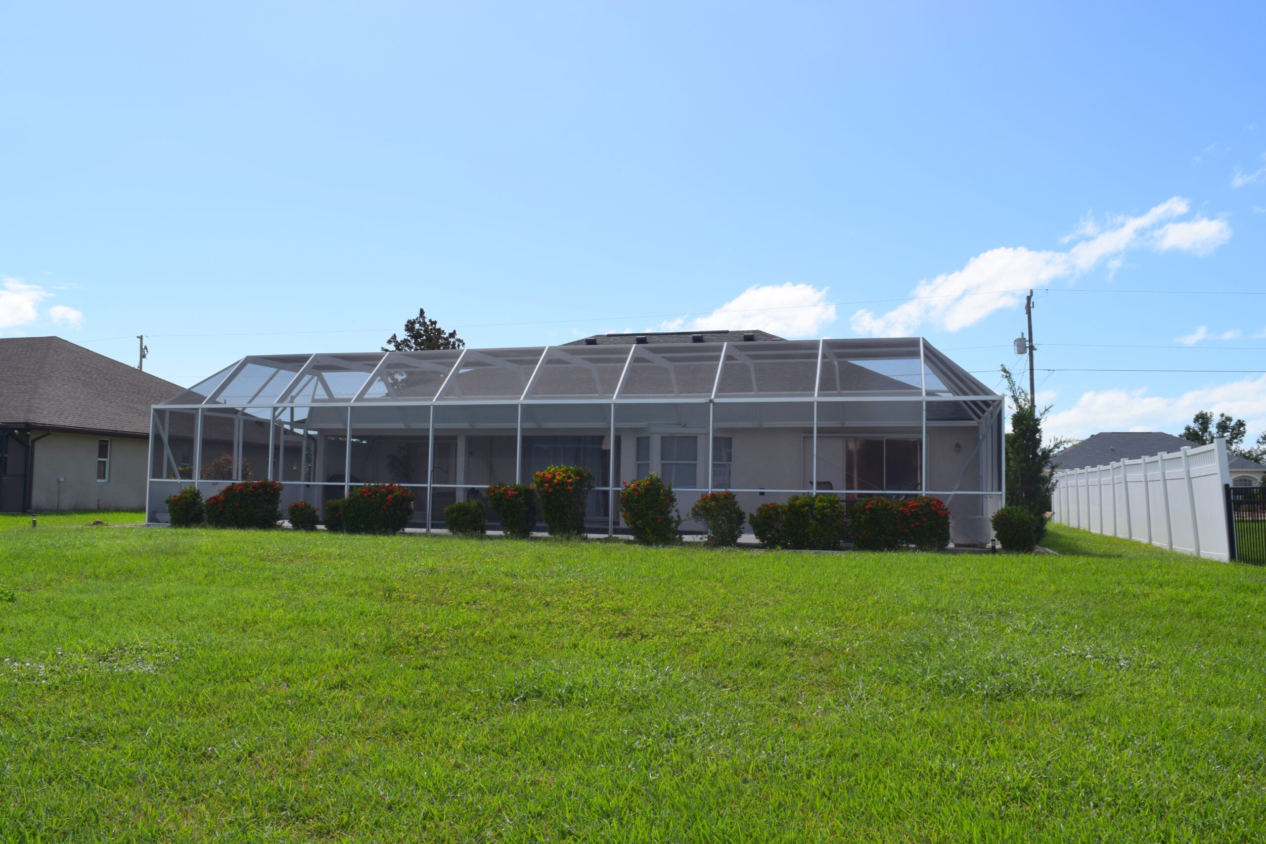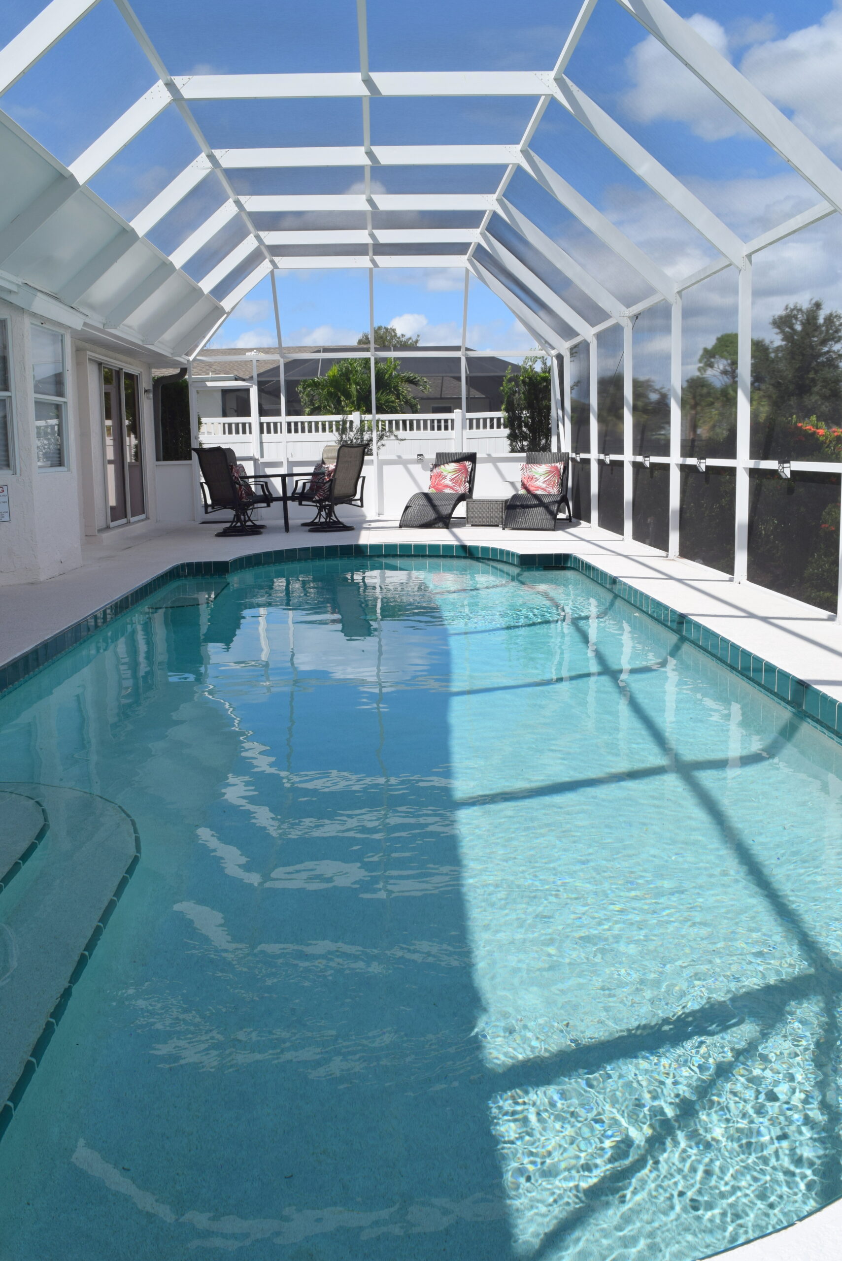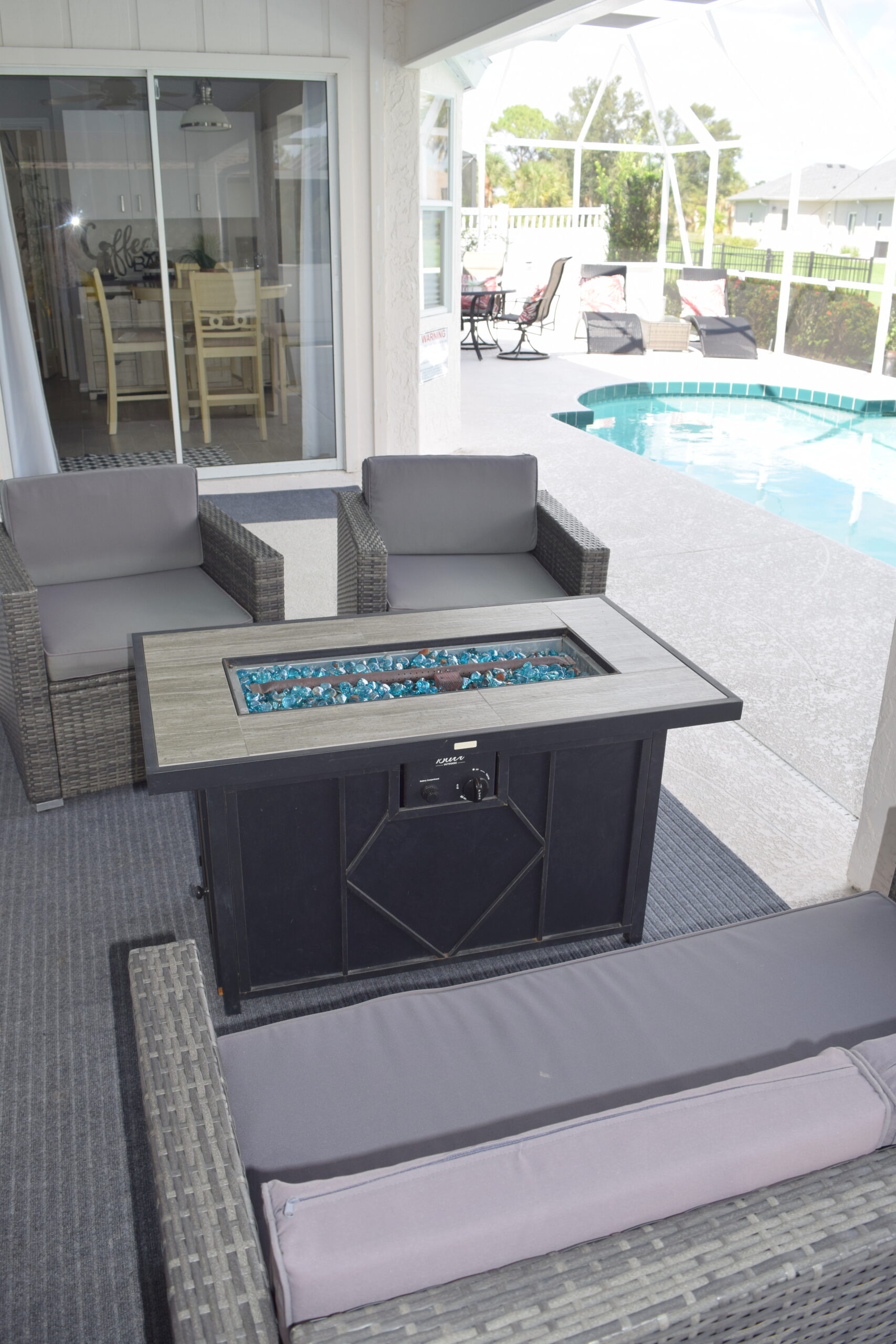 Welcome to the Sea Star Oasis. This cozy single-family residence features three bedrooms, two bathrooms, a spacious living area, a dining space, a fully equipped kitchen, a small breakfast area, and a delightful coffee bar for your coffee-making needs. As soon as you step inside, you’ll be captivated by the stunning vistas offered by the sliding doors to the enclosed heated pool and the picturesque view of the pond. The interior is adorned with wood-like tiles, with the exception of the bedrooms, which are carpeted. For entertainment, there are three large-screen televisions available for you and your guests to enjoy. Each TV is equipped to stream your preferred services. The dining area can accommodate six people, while the kitchen boasts modern countertops and stainless-steel appliances to support your culinary endeavors. The house is designed in a split bedroom layout, with the master bedroom set apart from the other two bedrooms to ensure privacy. The master bedroom features a king-sized bed and an ensuite with two vanity units, a walk-in shower, and a garden tub for relaxation. The guest bedrooms are each equipped with queen-sized beds. The guest bathroom is a combination tub/shower and is conveniently located between the two bedrooms. The pool area is large enough to enjoy a drink while soaking up the Florida atmosphere. Beyond the pond, you’ll catch a glimpse of one of the many golf courses in Rotonda West. A propane fire pit is available on the patio for those cool evenings. Come and experience this well-kept home in the sought-after neighborhood of Rotonda West.